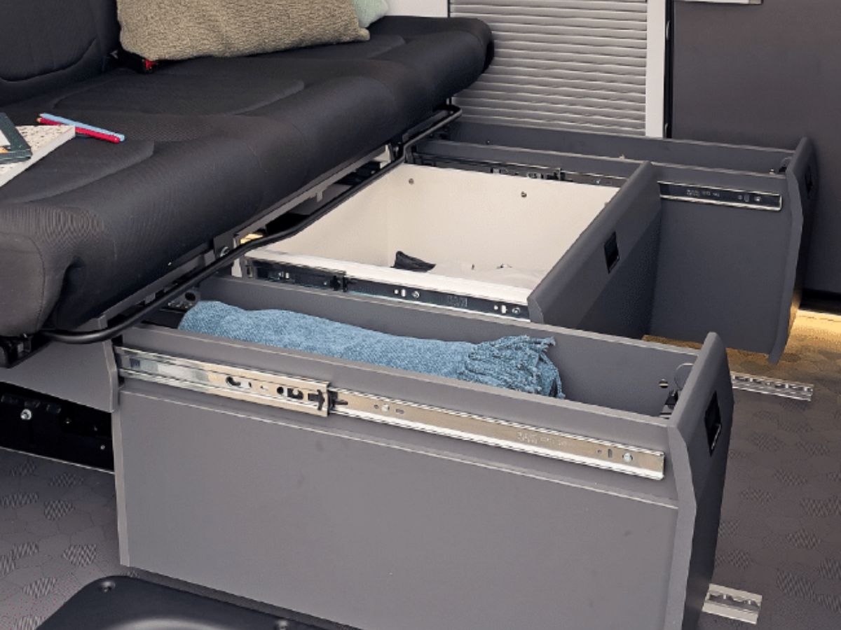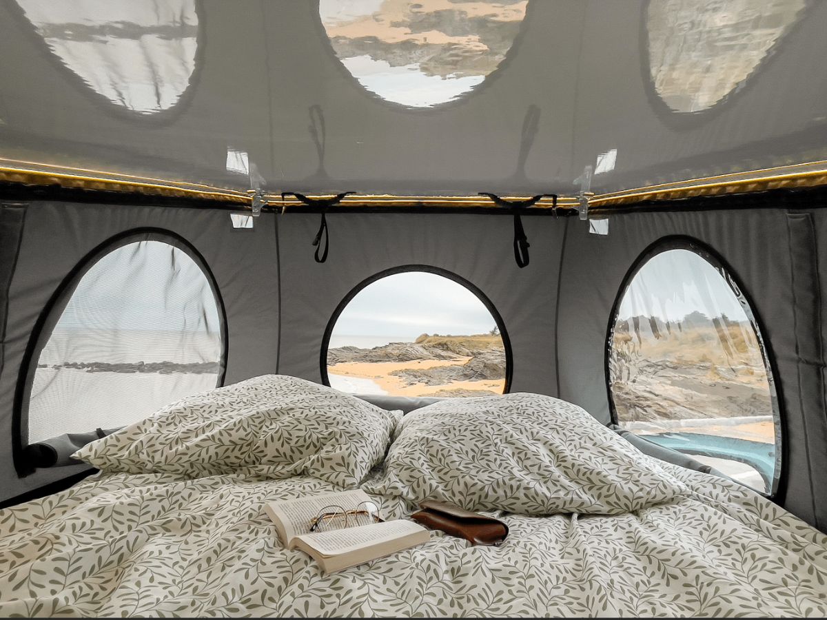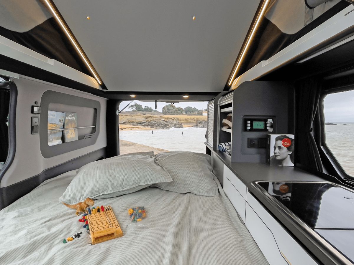 Après une journée bien remplie, rien de mieux qu’une nuit reposante à bord du TREK5+ pour repartir de plus belle le lendemain. La banquette arrière convertible avec le système “Smart Bed” offre un large couchage de 125 cm aux épaules et 192 cm de long. Le grand toit relevable propose un couchage de 140 x 195 cm avec un sommier à plots très confortable.