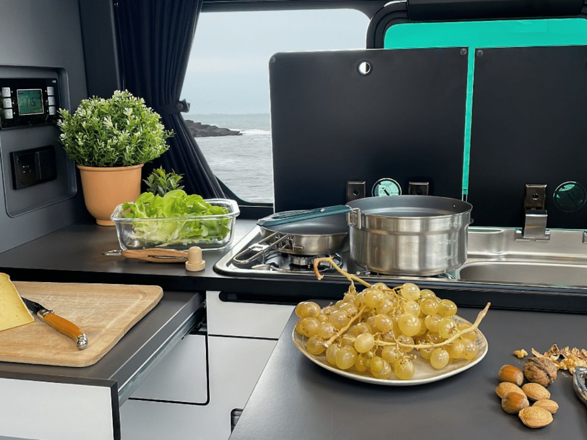 Bénéficiez d’un espace salon confortable et lumineux, pouvant accueillir 5 personnes. A l’intérieur, vous pouvez facilement installer la table grâce au large espace de vie. Le toit relevable libère des volumes et vous permet d’être debout à l’intérieur. Le module cuisine est compact et fonctionnel grâce à ses rangements, il dispose d’un large réchaud 2 feux à allumage piezo combiné à l’évier avec robinet intégré, réfrigérateur 51 litres silencieux.