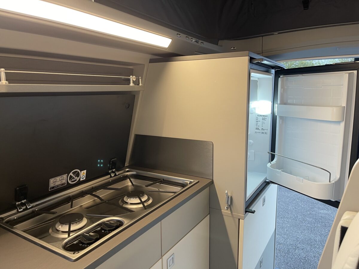 Le Westfalia Kelsey est doté d‘une cuisine équipée incluant un large plan de travail, des feux à gaz double et un système d’eau chaude/eau froide. Les voyageurs profiteront également d’un réfrigérateur spacieux, des réservoirs d’eau propre et d’eaux usées, de nombreux rangement.