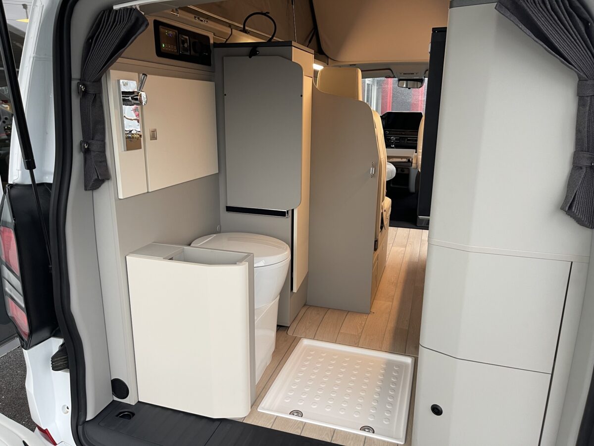 Côté sanitaire, ce véhicule intègre une douche privative (avec rideau d’intimité) et des toilettes permettant une grande autonomie.